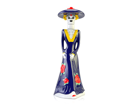 メキシコをイメージしたドクロの人形にメキシカン・ハット「ソンブレロ」、そして色とりどりのドレスのデザイン。手作りの陶器のボトルに詰められているブルーアガヴェ100%のプレミアムテキーラです。